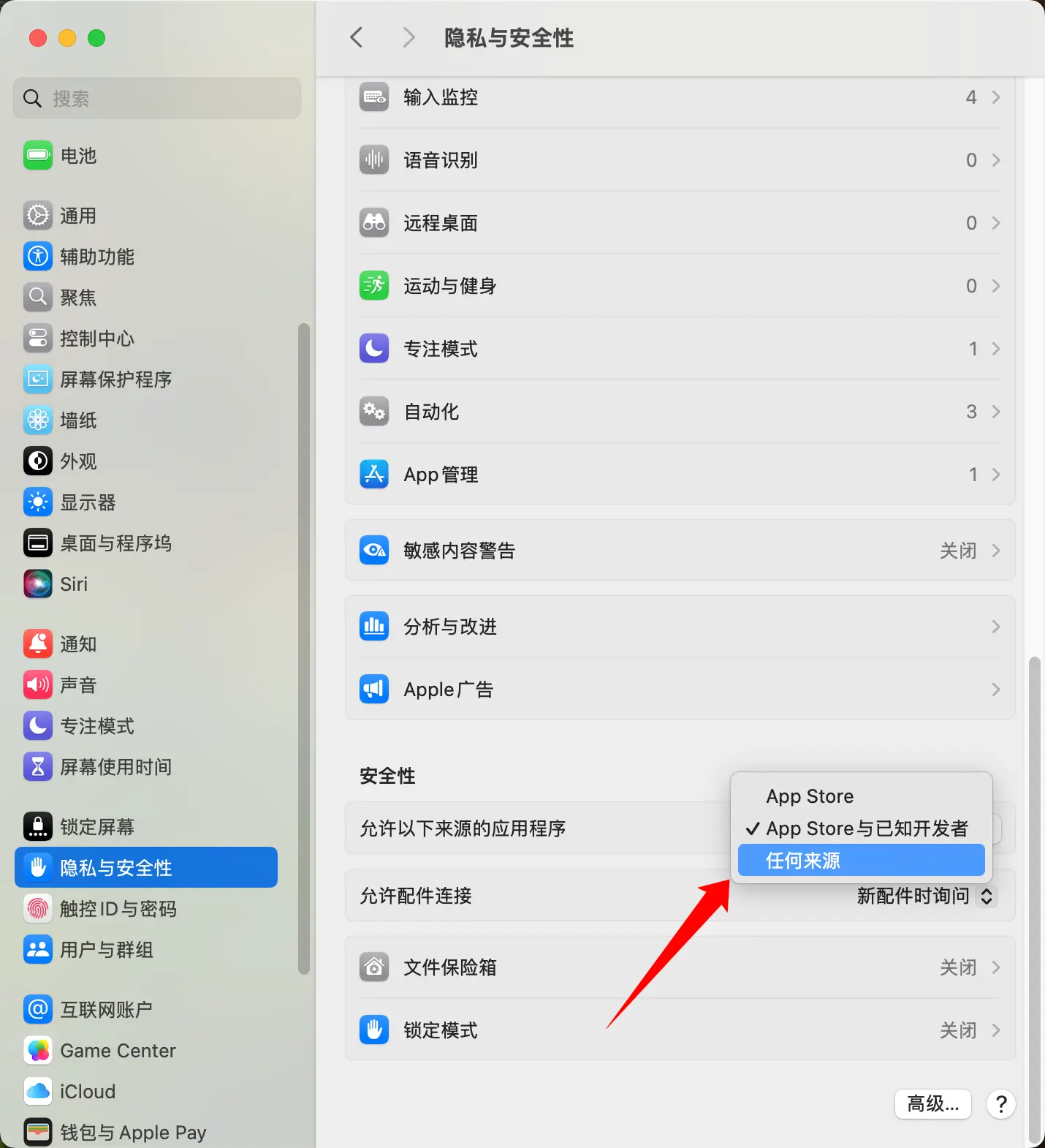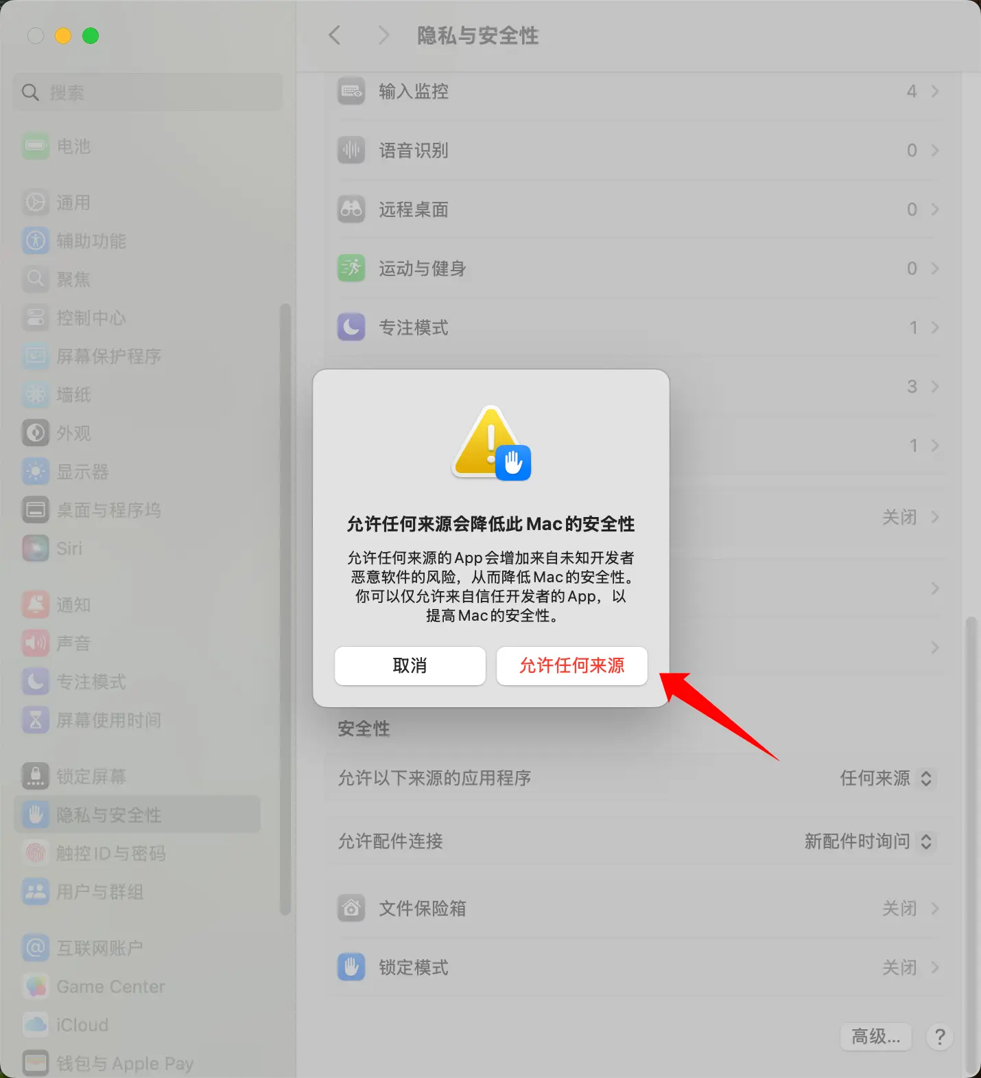 系统设置-隐私与安全性,在底下找到安全性-允许以下来源的应用程序,修改为允许任何来源